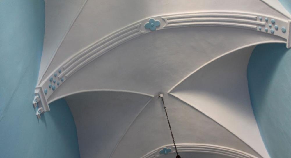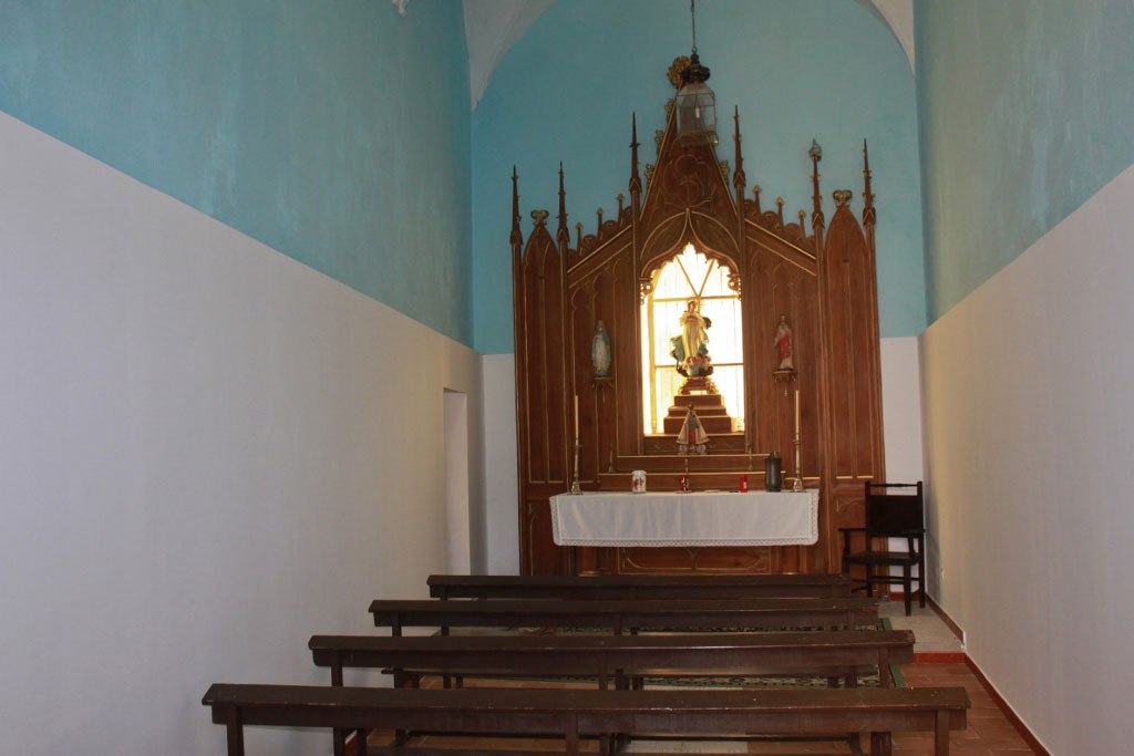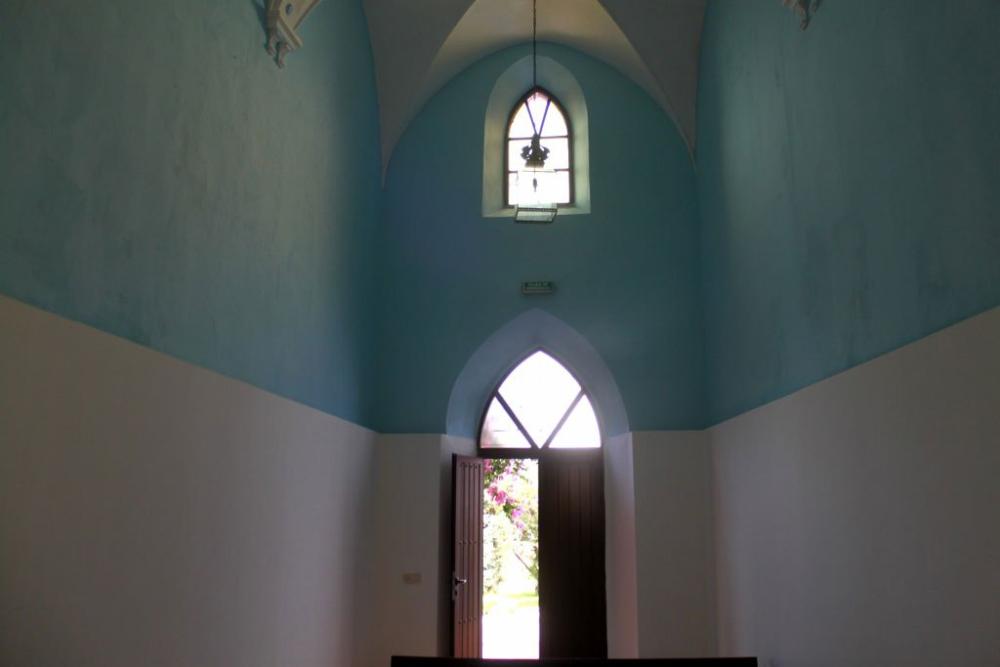 La bóveda esta en blanco y la pared se divide a la mitad: la superior de color azul celeste y la inferior en blanco. Ese contraste blanco - azul - blanco es bonito en general, y mejora cuando se funde con el marrón dominante en el suelo, bancos y el retablo de la cabecera.