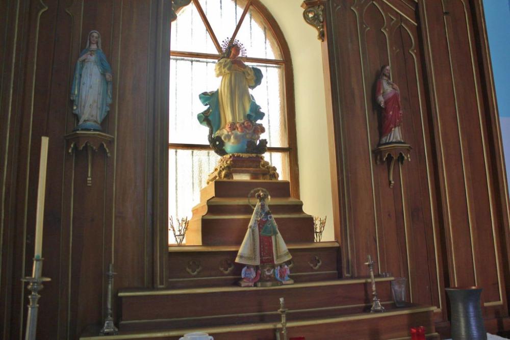 El retablo es sencillo, preside una imagen de la Inmaculada concepción escoltadas por el corazón de Jesús y la Virgen María.